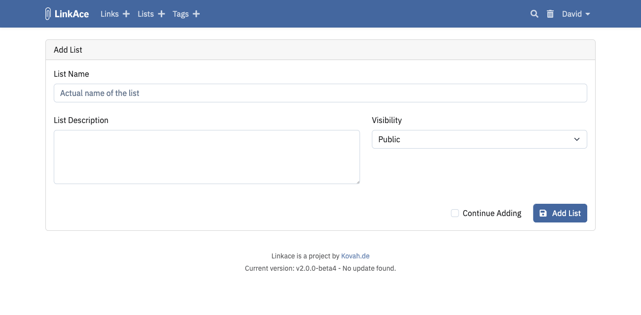 Lists can be added through the menu or directly in the link add form. If added by using the dedicated form accessible from the menu you have an additional option for making a list private. It will then be displayed only to you.