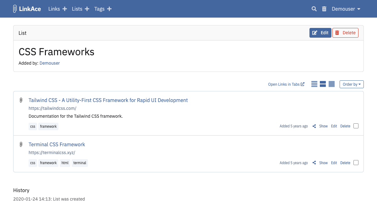 Other than tags, lists are meant to not directly categorize but bundle different types of links together for one topic. For example, the open-source tag categorized all links of open source projects and the macos tag categorizes all links for neat macOS apps. A Open Source macOS Apps list may contain links to your favourite, open source macOS applications, while both used tags are not directly related.