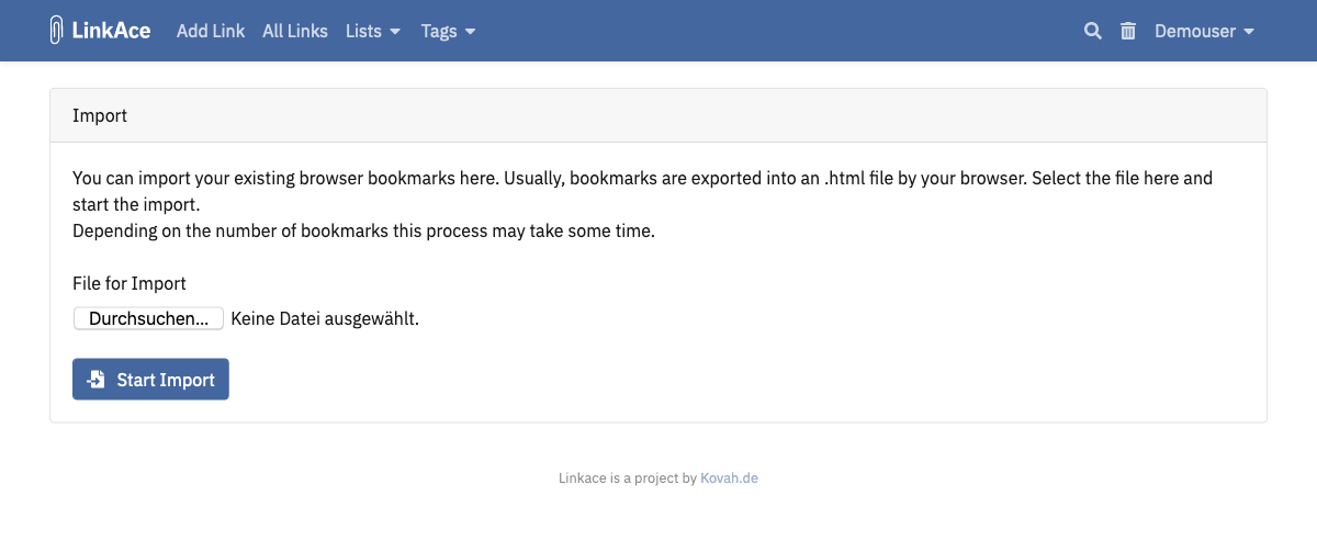 LinkAce provides a way to import existing bookmarks from your browser. Please notice, that you have to export your bookmarks in the HTML format. Other formats are not supported.