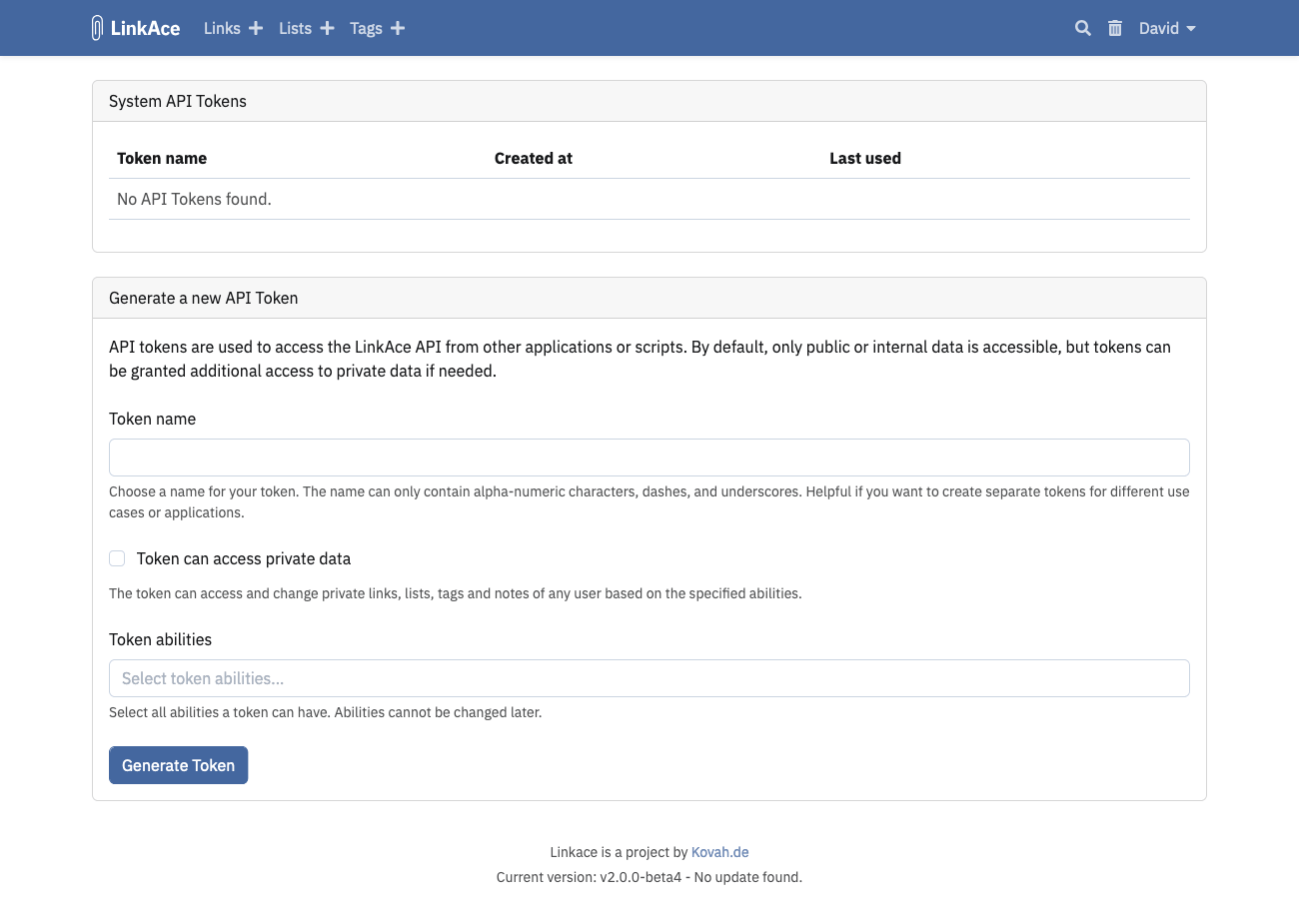 LinkAce has a comprehensive API which allows external applications to control content in LinkAce. Administrators can create advanced API tokens which are do not act like users, but the system itself. To make tokens more secure, you have to specify permissions for each token which cannot be changed later on.